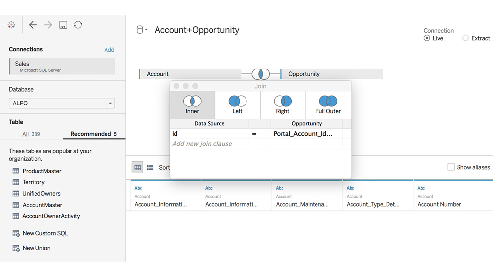 Dans Tableau 10.3, il est plus facile de trouver les données utiles pour l'analyse grâce aux recommandations intelligentes pour les tables et les jointures. Basé sur des algorithmes de machine learning, Tableau Server analyse l'utilisation des sources de données agrégées et pour recommander les tables et jointures les plus utilisées, dans toute l'entreprise. Grâce à ces recommandations, les clients peuvent gagner du temps en identifiant rapidement les tables de base de données utiles à leurs analyses et exploiter les jointures proposées pour enrichir leurs données. Dorénavant, ils peuvent facilement appliquer automatiquement les découvertes des experts et autres utilisateurs de tous les autres services, et améliorer ainsi la qualité globale de leurs modèles de données.