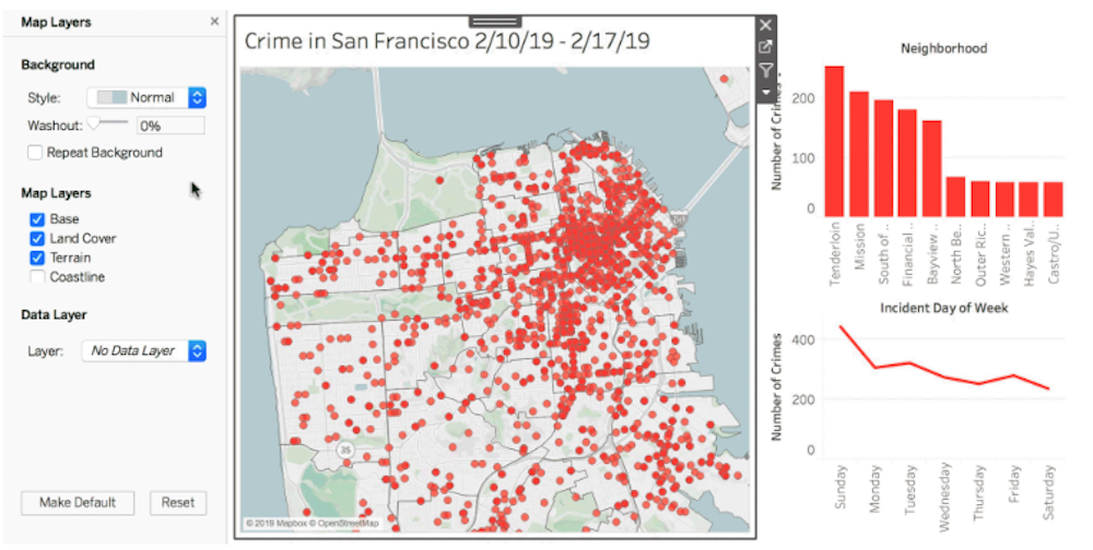 De plus en plus de décisions s'appuient désormais sur des données spatiales, et la demande explose. Selon le rapport Gartner récent, 30 % des interactions avec les clients s'appuieront sur des analyses géospatiales en temps réel d'ici 2022, contre seulement 4 % en 2017. Les nouvelles cartes vectorielles Tableau offrent une meilleure expérience que les solutions de cartographie classiques. Au lieu de charger des images, Tableau redimensionne les cartes lors de zooms ou de panoramiques, pour aider les utilisateurs à mieux s'immerger dans les analyses. La technologie de pointe de Mapbox propose également de nouvelles couches, comme la superficie au sol des bâtiments, les stations de métro, les gares, ou encore les informations topographiques et hydrographiques, pour donner davantage de contexte aux données spatiales.
