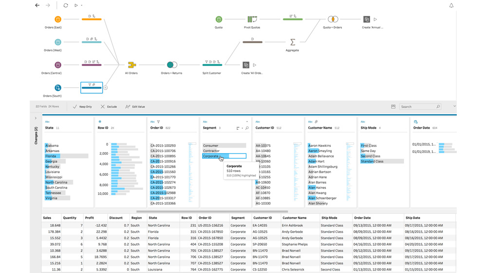 La préparation des données représente aujourd'hui l'une des plus grandes problématiques des clients. Selon une étude récente de Harvard Business Review, les utilisateurs consacrent 80 % de leur temps au nettoyage et à l'organisation de leurs données, et seulement 20 % à l'analyse proprement dite. D'ailleurs une grande partie de ces données ne peuvent pas être analysées à temps, parce qu'elles sont mal organisées ou dispersées dans des sources disparates. Mais leur restructuration peut se révéler compliquée et chronophage, et nécessite souvent des connaissances techniques particulières. Tableau Prep et son interface visuelle facilitent les tâches complexes les plus courantes, comme les jointures, les unions, les permutations et les agrégations. Il suffit d'effectuer des glisser-déposer, sans exécuter le moindre script. Les utilisateurs voient leurs données se transformer sous leurs yeux dans Tableau Prep. L'interface intuitive permet d'obtenir les résultats souhaités plus rapidement et en toute confiance.