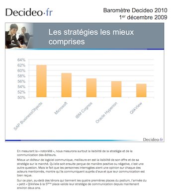 Réalisée en novembre 2009, cette étude analyse les réponses de 273 participants, provenant à 70 % d’utilisateurs en entreprise. Le baromètre présente une trentaine de graphiques et schémas qui passent en revue les pratiques des entreprises et leurs usages des solutions d’informatique décisionnelle.