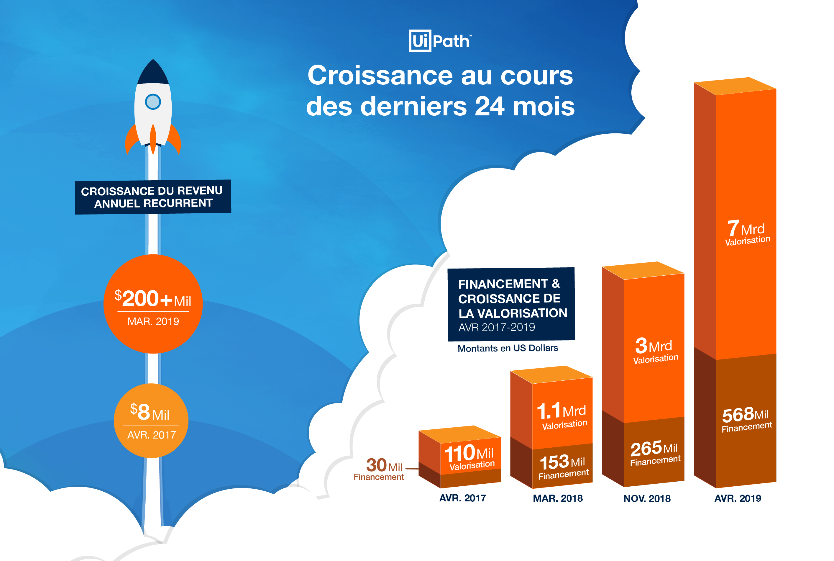 Avec cette valorisation à 7 milliards de dollars, UiPath est aujourd’hui l’un des éditeurs de logiciels d’Intelligence Artificielle (IA) ayant la croissance la plus rapide, le plus valorisée au monde. Depuis la clotûre de sa série A en avril 2017, UiPath a franchi plusieurs étapes étapes importantes :