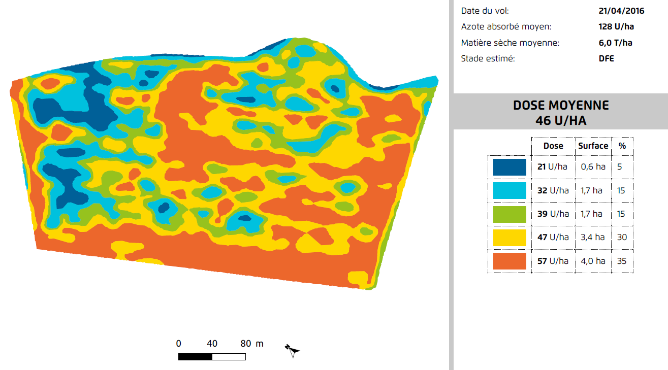 Les cartes de zonage fournies par AIRINOV permettent en effet d’apporter la bonne dose d’engrais, au bon endroit et au bon moment, au mètre carré près : cet engrais peut augmenter dans certaines zones et participer à un meilleur rendement, ou diminuer et ainsi réduire à la fois l’impact environnemental et le coût des intrants pour les agriculteurs.