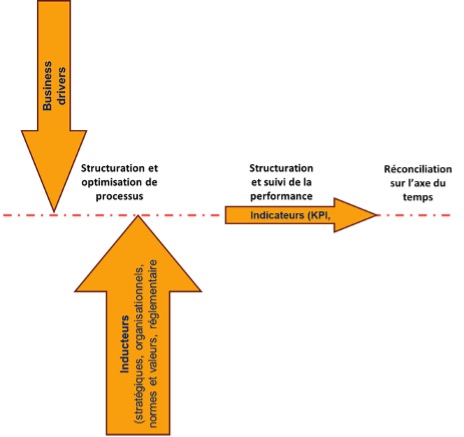 Figure 5 : articulation sur l’axe du temps des business drivers, inducteurs et indicateurs.