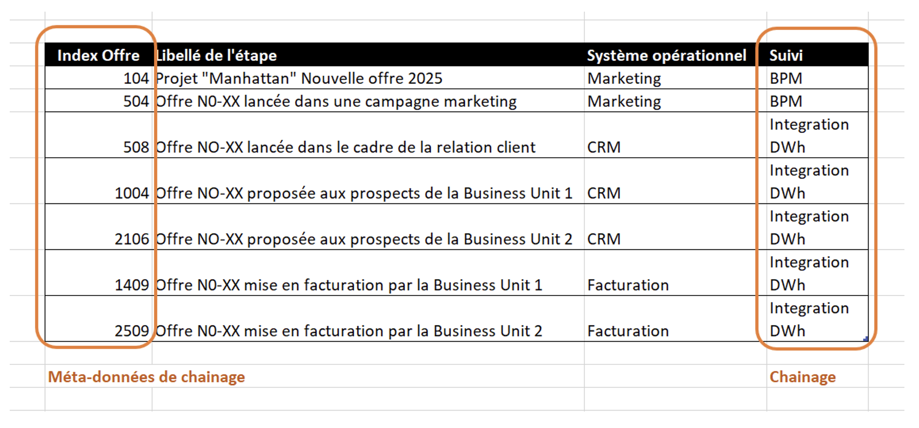 - Les index liés au chainage : ils permettent d'accéder rapidement à des informations spécifiques d’un domaine de données. Ces index permettent de suivre de « bout en bout » l’objet métier grâce au chaînage de l’intégration des données et des processus. L’objet métier sera ainsi analysé tout le long des différents systèmes opérationnels, l’entrepôt physique et logique.