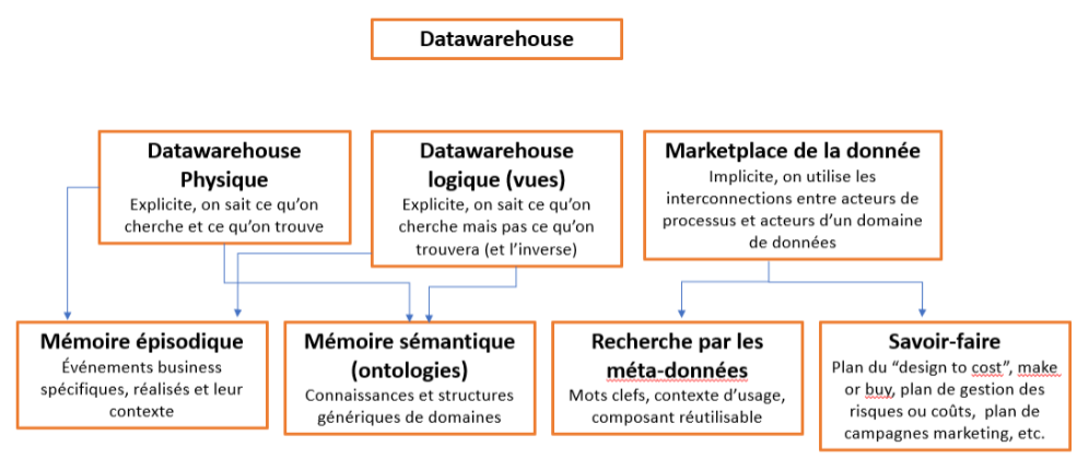 Pour terminer, nous rapprochons une data marketplace à la partie implicite de la mémoire épisodique de l’entreprise, celle qui traite les événements business spécifiques et leur contexte. Si la partie explicite est incarnée par l’entrepôt physique et logique, la partie implicite, incarnée par la data marketplace va jouer le rôle de « lien » en mettant en œuvre des interconnections entre acteurs de processus et acteurs d’un domaine de données.