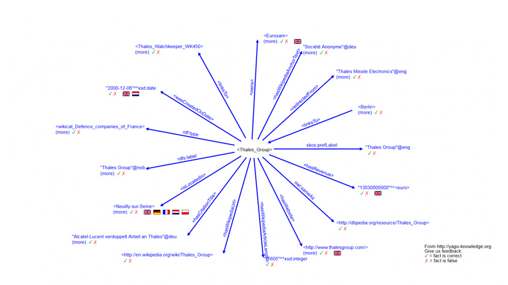La procédure mise au point pour Yago permet de contourner astucieusement cette tâche fastidieuse. La base de connaissance va de manière systématique puiser dans le réservoir de connaissances de Wikipédia. Non seulement l'information indiquant si telle personne est un(e) athlète ou un(e) politicien(ne), mais également la ou les relations existant entre les deux, vont se présenter dans un format lisible par la machine. Par conséquent, le lien « se trouve à » connecte Thales Group à Neuilly-sur-Seine. Comme chaque page Wikipédia est une entité dans Yago, les chercheurs peuvent fournir à la base de connaissance près de 17 millions d'entités et 150 millions de relations entre celles-ci.